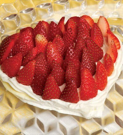 Receta para preparar un delicioso postre de merengue con chocolate blanco y fresas con crema.