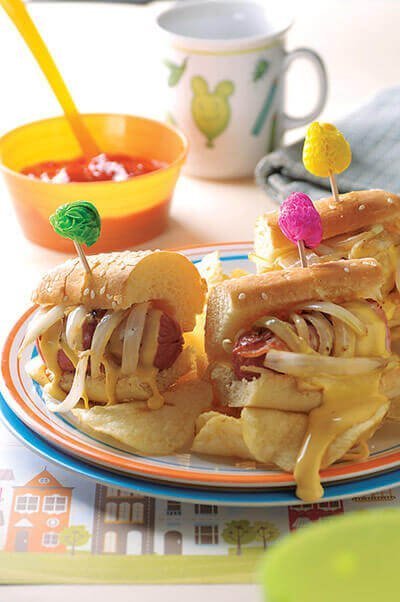 - Cortar los panes a la mitad, untar conla salsa para pasta y colocar la salchichatambién cortada por la mitad y colocarun poco de cebolla.