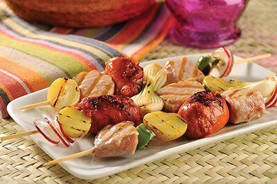 - Inserta en las brochetas, en diferente orden, un cubo de carne, seguido de un chorizo, una mitad de cebollita, papa cambray y chile cuaresmeño. Asa las brochetas a las brasas.