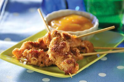 - Toma un palo de brocheta y alterna el pollo con el tocino. Espolvorea las brochetas en el pan molido y ásalas en una parrilla caliente (aproximadamente durante 8 minutos) por ambos lados.