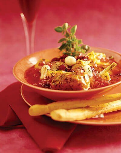 - En la misma sartén derretir 2 cucharadas de mantequilla, sofreir la cebolla y el perejil; agregar la mitad del vino blanco, el consomé granulado y el jugo de arándano. Agregar la carne y cocinar por 8 ó 10 minutos a fuego medio. Un poco antes de servir agregar el resto de vino, las papas y las cebollitas.