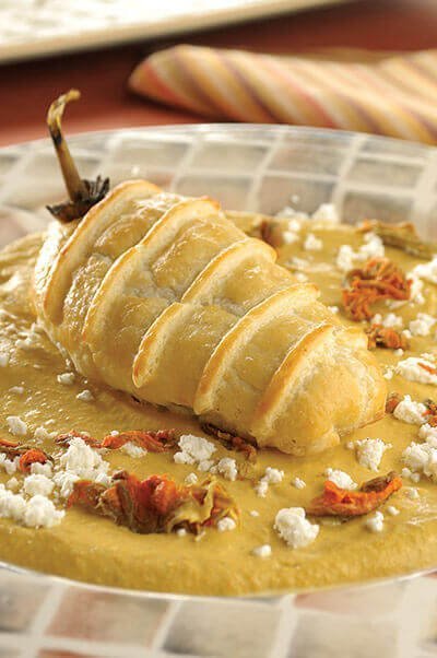 No te puedes perder de probar estos deliciosos chiles hojaldrados rellenos de queso de cabra, acompañados de una salsa de flor de calabaza.