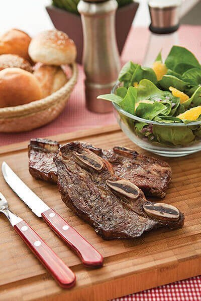 Receta para preparar una exquisita costilla de res, acompañada por una ensalada de espinaca y naranja.