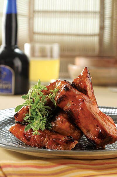 - Después de marinar, dorar ligeramente las costillas en una sartén y colocarlas luego en una charola y brochearlas con un poco de la salsa; posteriormente hornear a 180° C por 25 minutos.