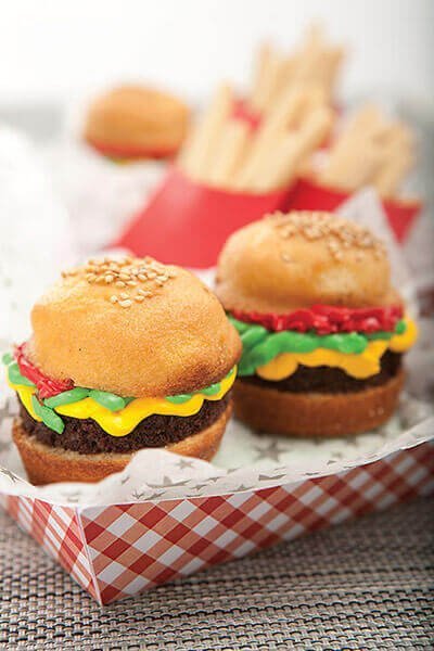 - Aplica betún (en los diferentes colores) en todo el rededor del brownie (carne de la hamburguesa) para emular el queso, la lechuga y el jitomate.