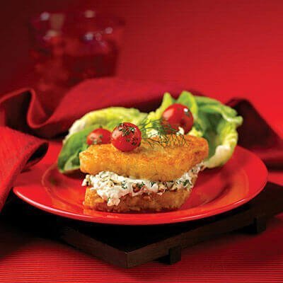 - Cuando los triángulos de papa hash brown estén listos, sacarlos del horno. Encima de cuatro triángulos repartir la mezcla de queso, espolvorear nuez y eneldo; colocar otro triángulo encima y presionar un poco. Servir con la ensalada de su preferencia.