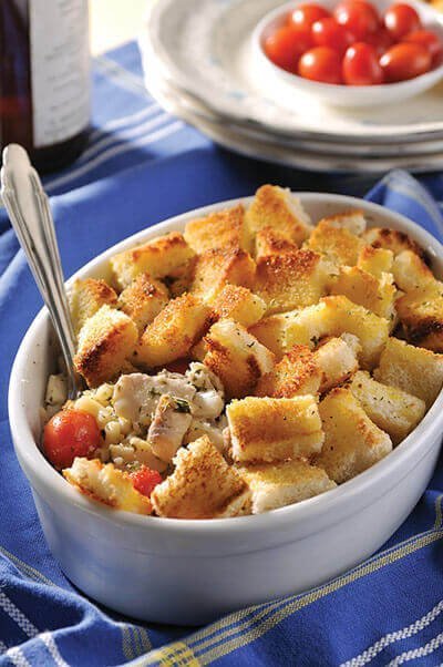 - Cortar el pan de caja en piezas de alrededor de 2 cm y acomodar sobre la mezcla de pescado.