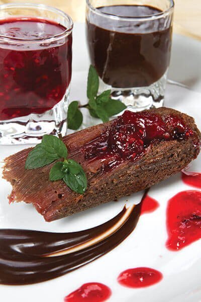 - Cocer aproximadamente 45 minutos. Servir acompañado de chocolate líquido, compota de frutos rojos y una hoja de menta como decoración.
