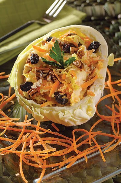 Utiliza las capas de col como bowl y rellénalas de una fresca ensalada de col con zanahoria.