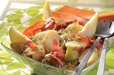 - Colocar el germen de alfalfa en un platón y sobre éste las papas con las peras y el tocino previamente frito en su propia grasa.