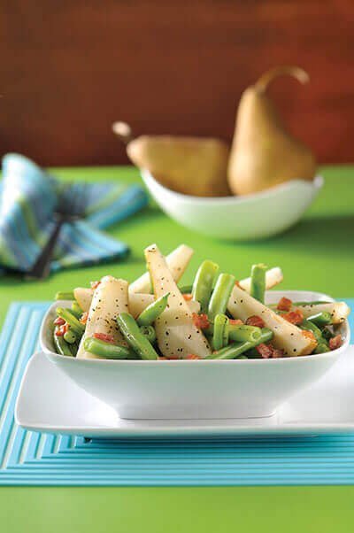 Una original ensalada puede ser la combinación de peras, ejotes y tocino.