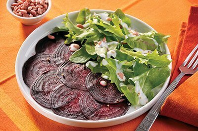 - Distribuir el betabel y las lechugas en platos, agregar el aderezo y espolvorear los piñones.