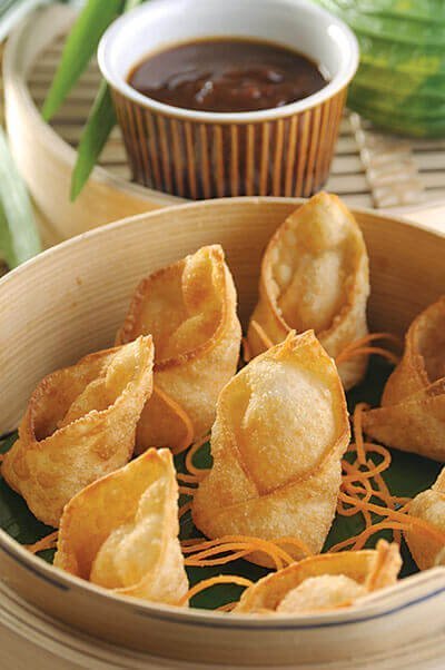 - Con esta mezcla rellenar las hojas de Won Ton y cerrar en forma de triángulo con un poco de huevo en las orillas.