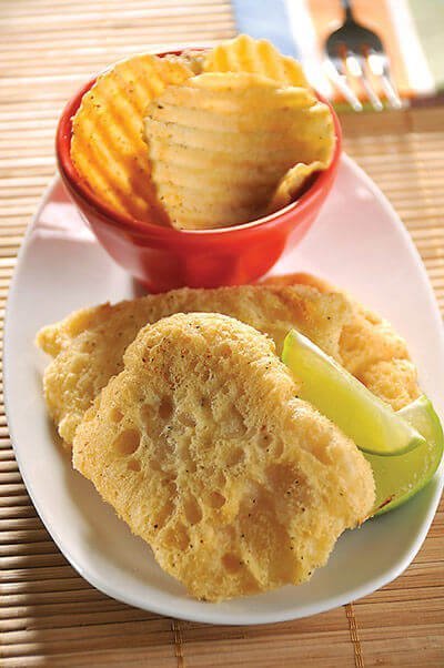 - Pelar las papas y rebanar finamente, freír en el aceite caliente de 2 a 3 minutos hasta que estén crujientes. Dejar escurrir sobre papel absorbente.