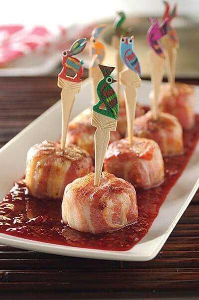 - Tomar una rebanada de plátano untar con queso crema, colocar una segunda rebanada de plátano y envolver con una tira de tocino.