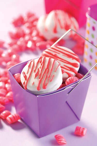 - Tomar un bombón con un tenedor y sumergir en el chocolate, escurrir el exceso y colocar sobre papel encerado hasta que el chocolate endurezca. Decorar la superficie con un poco de chocolate pintado.