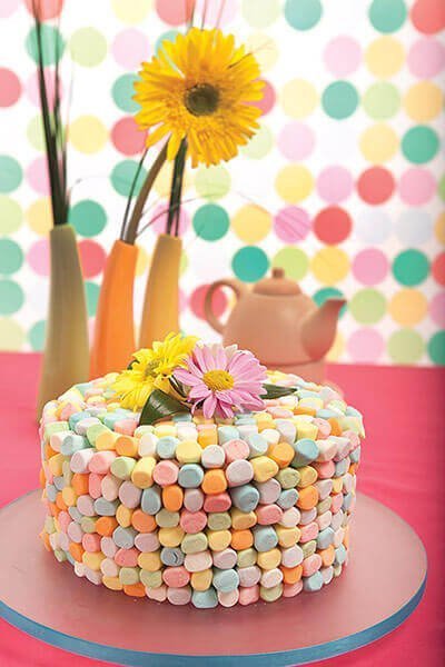 - Una vez frío, desmolda con cuidado. Unta el betún en el pastel y pega los bombones en todo el rededor. Para obtener un diseño uniforme o simétrico, comienza por colocar los bombones en forma circular, pero empieza en la base.