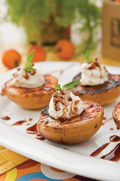 - Pasa las mitades de melocotón a un plato y decora con el merengue de queso. Rocía con miel maple, decora con las nueces restantes y una hoja de menta o yerbabuena.