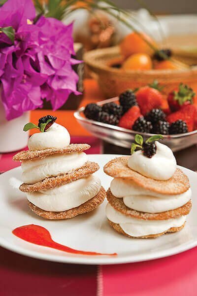 - Colocar un poco de crema en la base del plato antes de poner el primer buñuelo (así no se moverán las torres al momento de llevarlas a la mesa). Una vez colocado el buñuelo, agregar un poco de la crema, colocar otro buñuelo, un poco más de crema, el últim