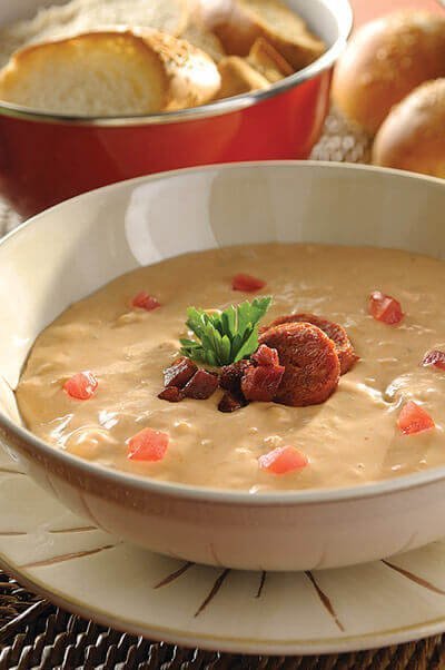 Prepara esta crema de alubias con tocino y chorizo para agregarle un toque español a tu menú.