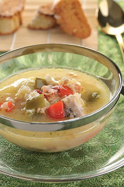 Agrega a tu caldo de pescado unos trozos de pimiento rojo y verde, con una ligera base de leche. Suena delicioso, ¿verdad?